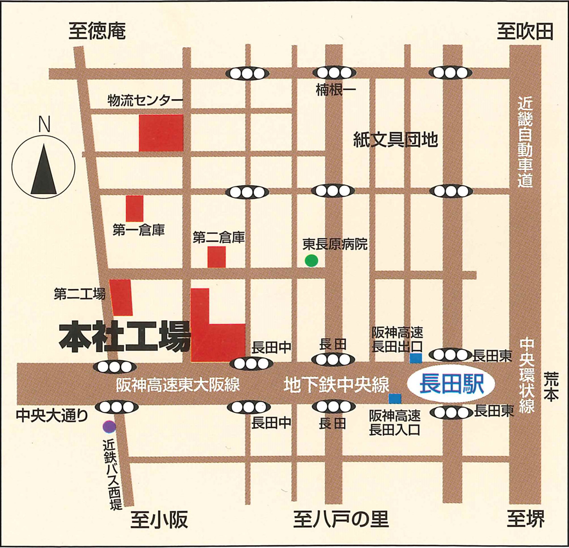 ※目印 本社工場西向かいに「牛庵長田店」がございます。北隣に「極楽湯東大阪店」がございます。